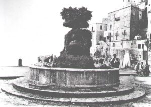 Nelle prime cartoline “viaggiate” si osserva la fontana posizionata sul bordo della spiaggia. La prima immagine in primo piano della fontana è datata 1915, una donna riempie un orcio, si osservano i leoni che danno le spalle al mare. Si tratta dell’immagine che attualmente è stata stampata anche sul cartello di cantiere.