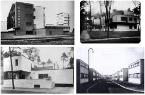 Visto dagli occhi di Ise, il sogno Bauhaus non è soltanto tecnica e lavoro d’officina, ma un vivace laboratorio di rapporti umani: illusioni e tragedie di uomini e donne controcorrente che ai rigurgiti secessionisti e all’esaltazione nazionalista, opposero una visione differente dell’architettura e del mondo. (nella foto sopra da sin. in alto in senso orario – Dessau: Sede del Bauhaus, “case dei maestri”, “casa del direttore”, vista dell’insediamento residenziale a Törten)