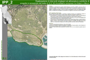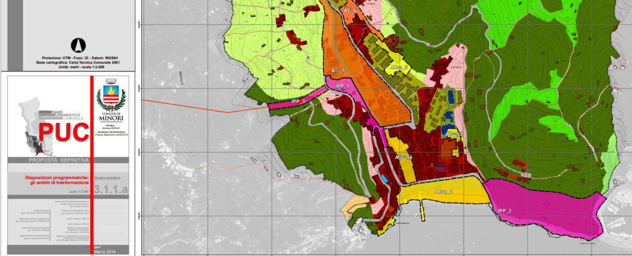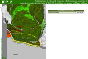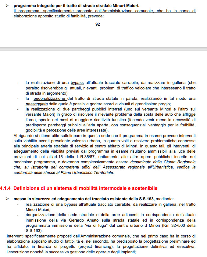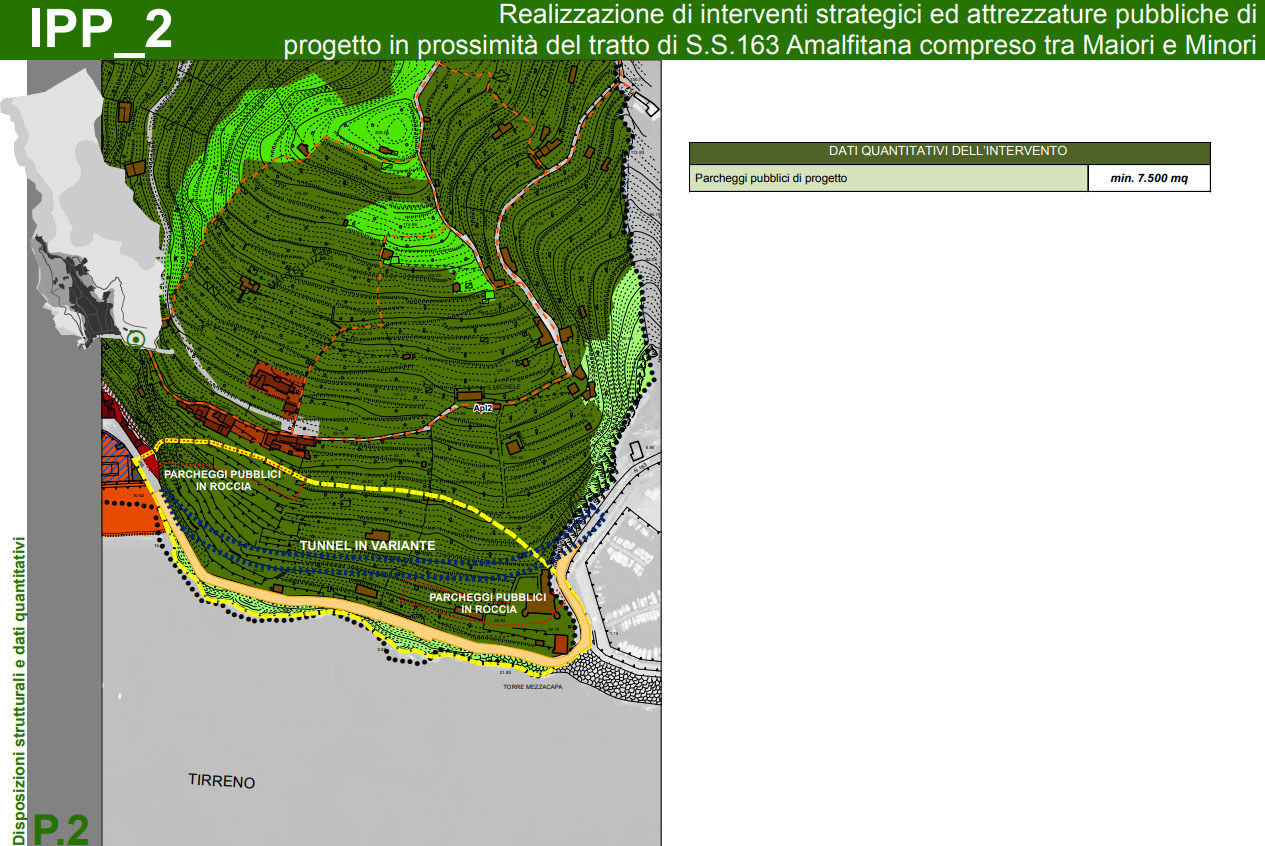 - Infine il sindaco ha ripetutamente affermato che la galleria era prevista nel PUC (le foto a corredo di quest’articolo fanno riferimento a questo punto). Bene, allora andiamo a vedere cosa è previsto nel PUC. L’ipotesi di realizzare una galleria tra gli abitati di Minori e Maiori compare al punto 4.1.3 della relazione generale del piano regolatore denominato “La tutela, il recupero, la valorizzazione e riorganizzazione della struttura insediativa”, laddove si legge: “Il programma, specificatamente proposto dall’Amministrazione comunale, che ha in corso di elaborazione apposito studio di fattibilità, prevede: la realizzazione di una bypass all’attuale tracciato carrabile, da realizzare in galleria (che peraltro risolverebbe gli attuali, rilevanti, problemi di traffico veicolare che interessano il tratto di strada in argomento”. Al punto successivo 4.1.4 “Definizione di un sistema di mobilità intermodale e sostenibile” si legge: “messa in sicurezza ed adeguamento del tracciato esistente della S.S.163, mediante: – realizzazione di una bypass all’attuale tracciato carrabile, da realizzare in galleria, nel tratto Minori-Maiori” (immagine 1). Per quanto riguarda la letteratura è tutto qui: sette righe. Veniamo ai grafici. Queste intenzioni sono mostrate nelle tavole delle disposizioni programmatiche, documento 3.1.1.a, dove l’area destinata al by-pass in galleria è colorata in fucsia (immagine 2) ed indicata con la sigla IPP_2 ovvero “Programma integrato per il tratto di strada Minori-Maiori”. Questi interventi strategici fanno parte di una serie di schede (documento 3.2.1 revisionato l’ultima volta nel 2016). Alla voce obiettivi si legge: “Il programma, specificatamente proposto dall’Amministrazione comunale e dall’UTC, che ha in corso di elaborazione apposito studio di fattibilità, prevede la realizzazione di un intervento prevalentemente volto a migliorare la viabilità in un punto fortemente critico della S.S.163, ad incrementare la dotazione di parcheggi pubblici in prossimità del litorale, in modo da evitare la penetrazione di auto di non residenti nel centro abitato, la riqualificazione paesaggistica ed ambientale di un suggestivo scorcio della Costiera Amalfitana” (immagine 3). Nella tavola P.2 col tratteggio in blu viene indicato un “tunnel in variante” (in variante poiché non previsto dalla legge regionale del piano urbanistico territoriale) che non interessa neanche il Comune di Maiori poiché parte, pare incredibile, pressappoco dall’imbocco della grotta dell’Annunziata e termina parallelamente al tracciato viario esistente e ben prima del lungomare, senza modificare nessuno dei due (immagine 4).