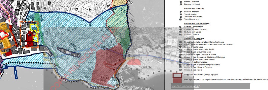 Infine un’altra imprecisione (non propriamente del sindaco) vuole che l’ANAS sia stata orientata ad optare per quel tipo di tracciato (più lungo, più costoso e distruttivo per il lungomare di Minori fuoriuscendo in direzione perpendicolare alla roccia) per evitare l’area sottoposta a vincolo archeologico posto a difesa della grotta dell’Annunziata. Non è così, lo si evince proprio sovrapponendo la tavola dei vincoli del piano regolatore al tracciato di progetto redatto dall’ANAS (in blu) che all’imbocco di Maiori attraversa chiaramente l’area vincolata (in rosso). (Immagine cinque).Queste inesattezze aggiungono nuovo materiale alla sventurata storia della galleria Maiori-Minori; una vicenda fatta di omissioni, scopi non dichiarati, opacità…