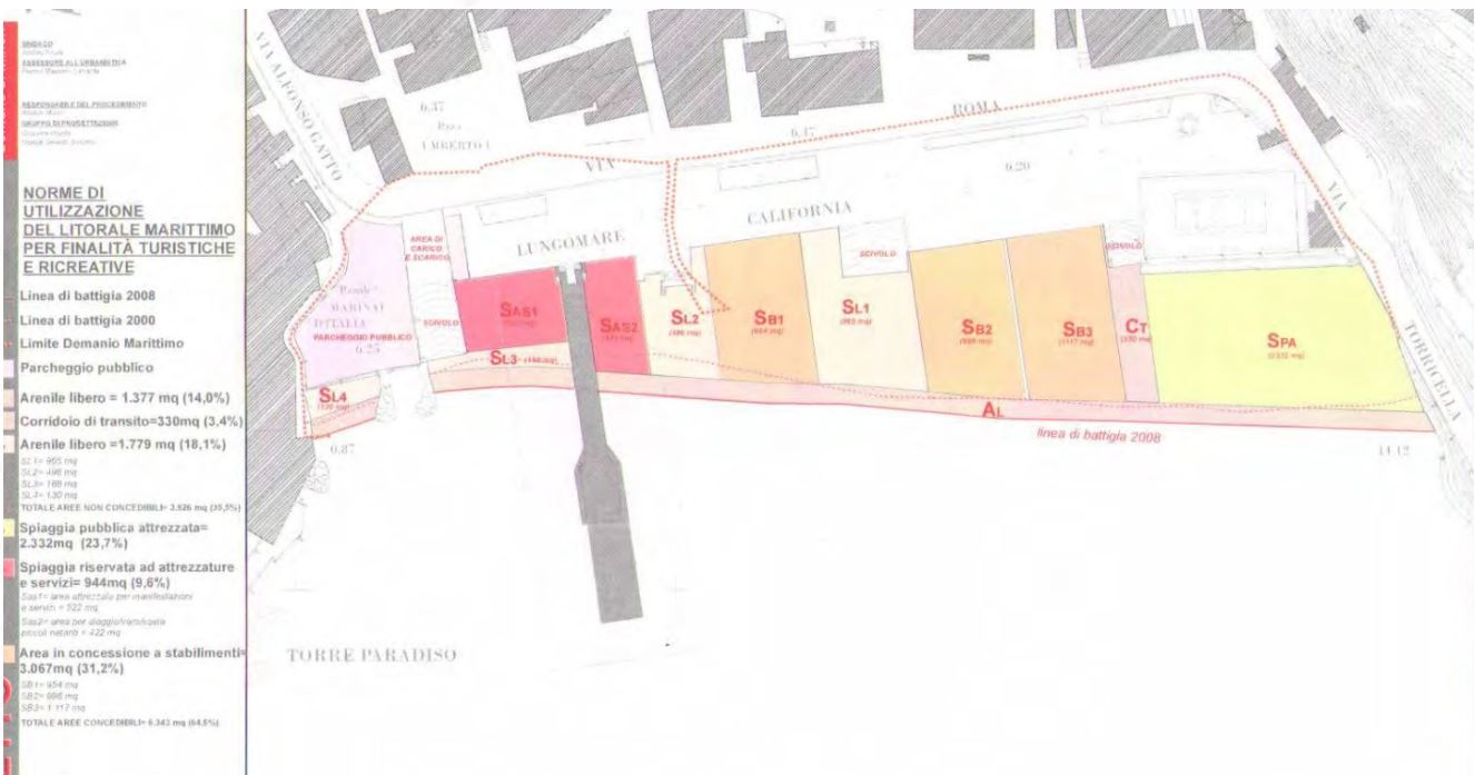 Tra le altre cose viene regolamentato lo spazio definito “Spiaggia Pubblica Attrezzata” (SPA) individuata nell’area ad est dell’arenile per 2332 mq. (in giallo a destra nell’immagine).