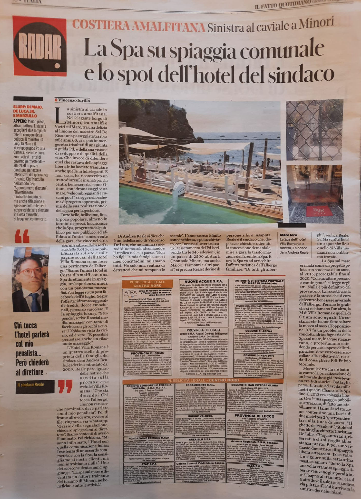 Tale Mini Centro Benessere (“Mini”, da ora omesso) rientrava fin da subito nell’offerta commerciale turistica dell’Hotel Villa Romana, pubblicizzata sul sito. Il caso, con le relative spiegazioni, balza agli onori della cronaca tramite un articolo a firma di Vincenzo Iurillo, dal titolo “Sinistra al caviale a Minori – La SPA su spiaggia comunale e lo spot dell’hotel del Sindaco” (in foto) pubblicato da “Il Fatto Quotidiano” il 21 luglio 2022. (L’articolo si può leggere cliccando QUI)