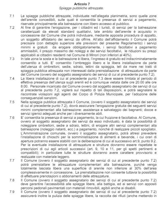 Le modalità di fruizione della “Spiaggia Pubblica Attrezzata” è ben descritta nell’articolo 7 (immagine).