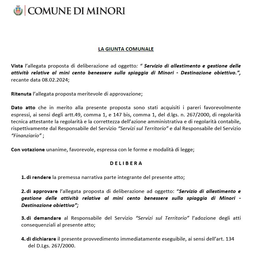 Infine, con la delibera n.14 del 14 febbraio 2024 (nell’immagine), in merito al Centro Benessere si proponeva di intervenire “mediante l’istituto della proroga del contratto, agli stessi patti e condizioni, (per ulteriori tre anni: 2021-2022-2023, al fine di garantire il riequilibrio economico e finanziario della concessione leso nel 2020 dalla situazione di pandemia da COVID-19 (…) al fine di garantire anche per la prossima stagione balneare l’allestimento e la gestione di un mini centro benessere”.