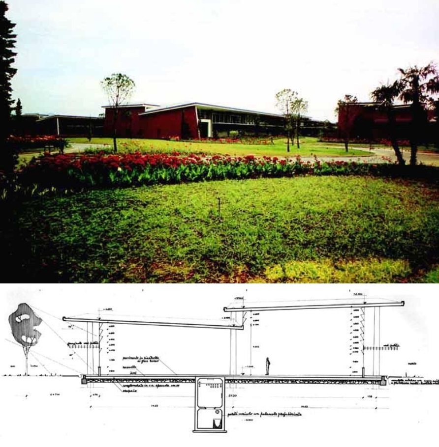 Il padiglione, orizzontale coi suoi brise soleil, dialogava col giardino circostante. Le lunghe superfici vetrate svincolavano la forma dalla struttura, moderna ed efficiente, a telaio in acciaio.