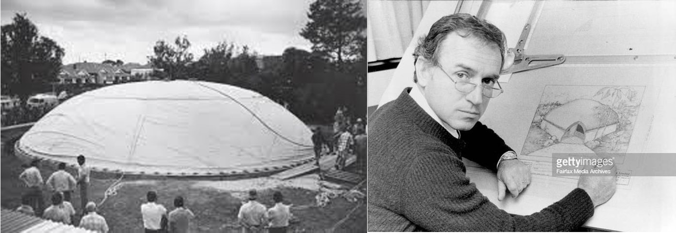 La leggenda narra che l’architetto si trovasse all’interno di una struttura gonfiabile a giocare a tennis, mentre fuori iniziò a nevicare. Così immaginò si potesse costruire grazie all’aria, sollevando da terra superfici in calcestruzzo ancorché ancora allo stato fluido.
