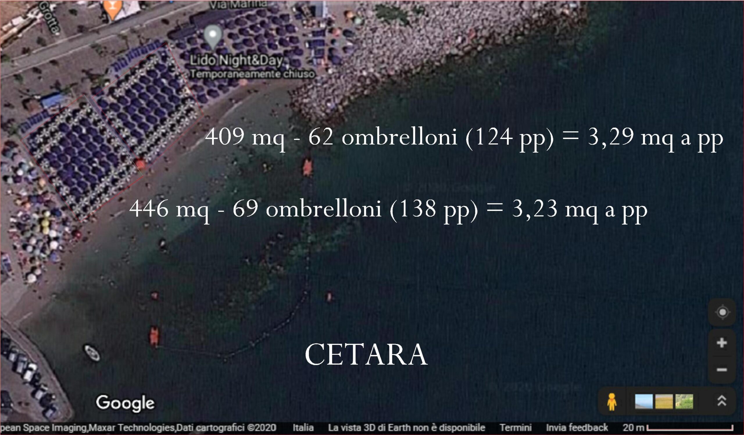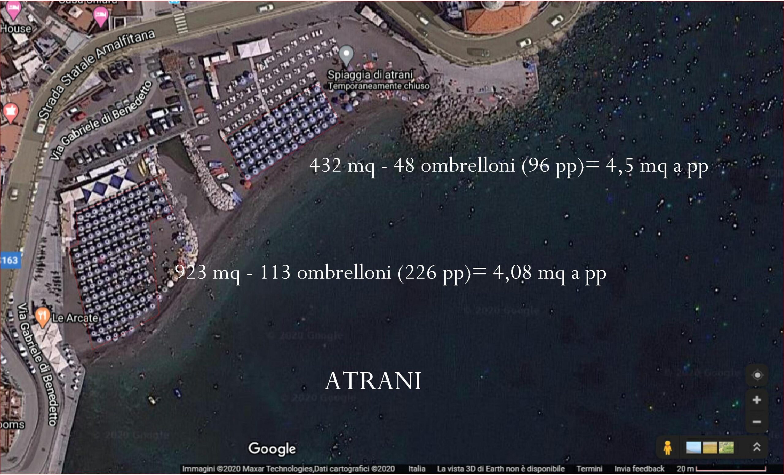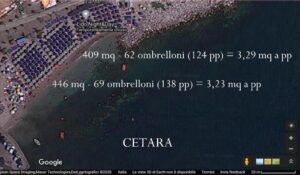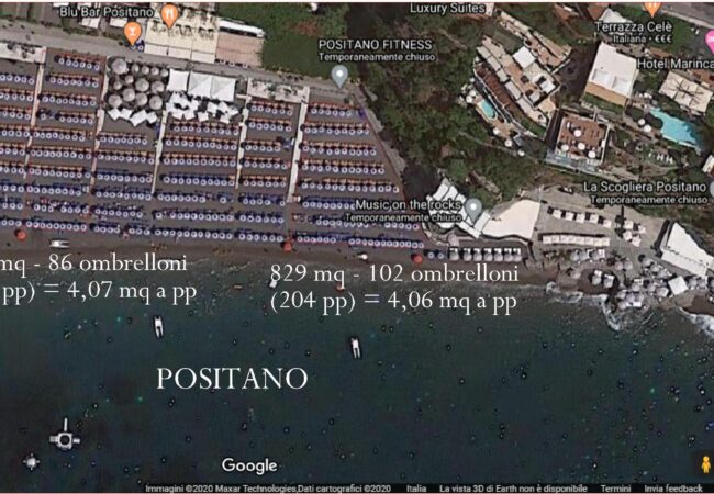 Dalla vista satellitare di google è facile verificare in rapporto alla superficie, quanti ombrelloni venivano posizionati sulle spiagge in concessione della costa d’Amalfi. I dati sono piuttosto omogenei.