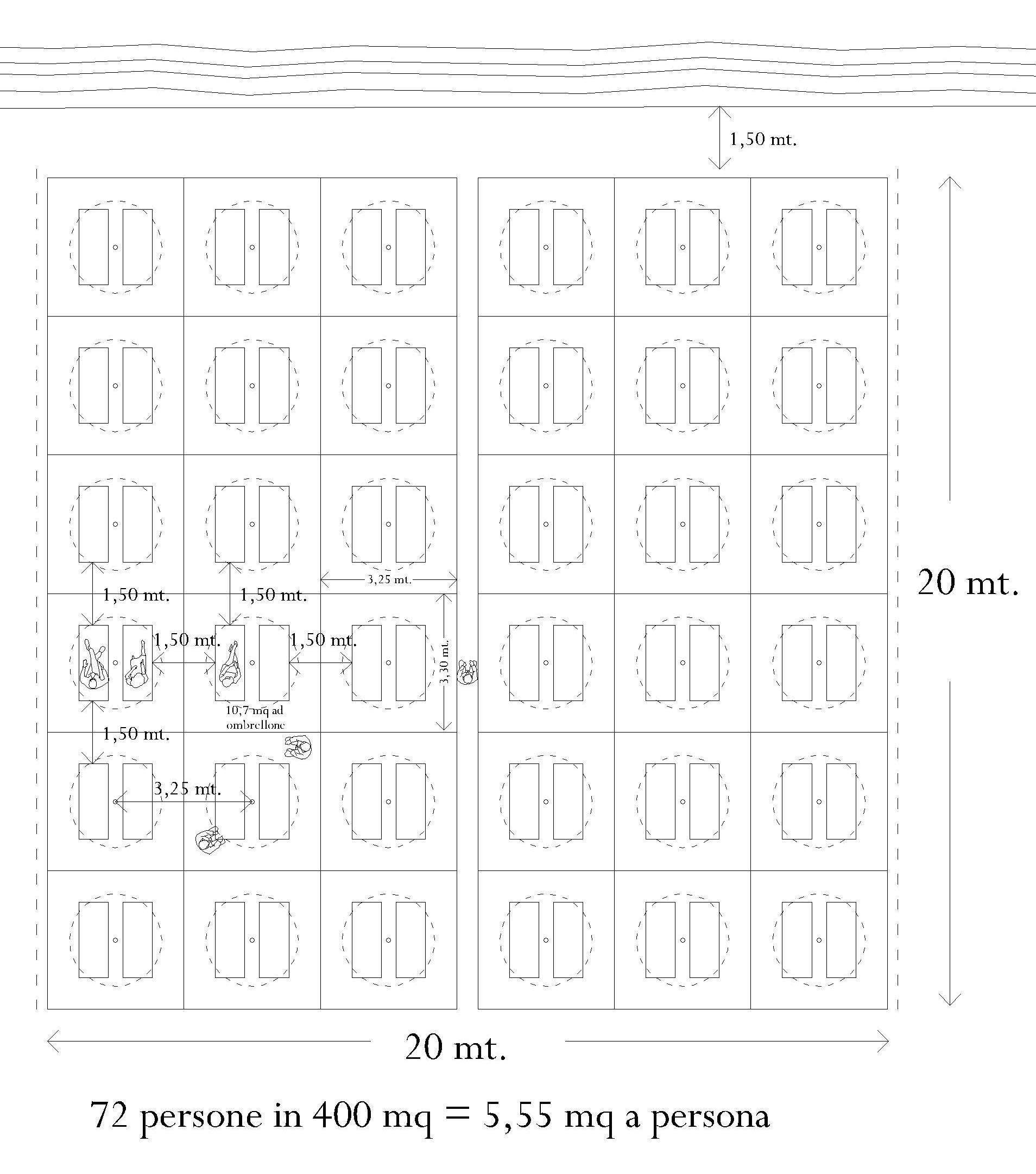 La nuova disposizione degli ombrelloni sarebbe all’incirca quella mostrata nello schema nel quale si suppone una spiaggia quadrata di 20 metri di lato, dove i lettini sono stati separati con il previsto metro e mezzo e ad ogni ombrellone viene lasciata un’area di 10,7 mq (meno di cosi bisognerebbe accostare ulteriormente i lettini posti sotto il medesimo ombrellone).