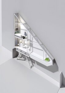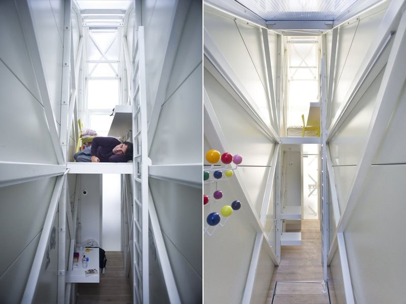 La casa con struttura metallica, assemblata in officina e poi incastrata tra i due edifici, è disposta su due livelli, vi si accede da una scala sul retro della strada che conduce al piano dove è sistemato un cucinino e il bagno (nella parte più larga). Una scala a pioli permette di raggiungere il letto al livello superiore accanto al quale c’è una scrivania. La casa attinge la luce dai lati e da una piccola finestra posizionata in alto sulla copertura inclinata. Nelle foto, all’interno della sua dimora, Keret sorride allegro, in equilibrio sulla scala e disteso nel suo letto.
