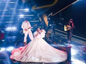 Nell’ultima serata di certo non è passato sotto traccia anche l’abito bianco che ha occupato tutto il palco della cantante del duo “La rappresentate di lista”, firmato Veronica Lucchesi.