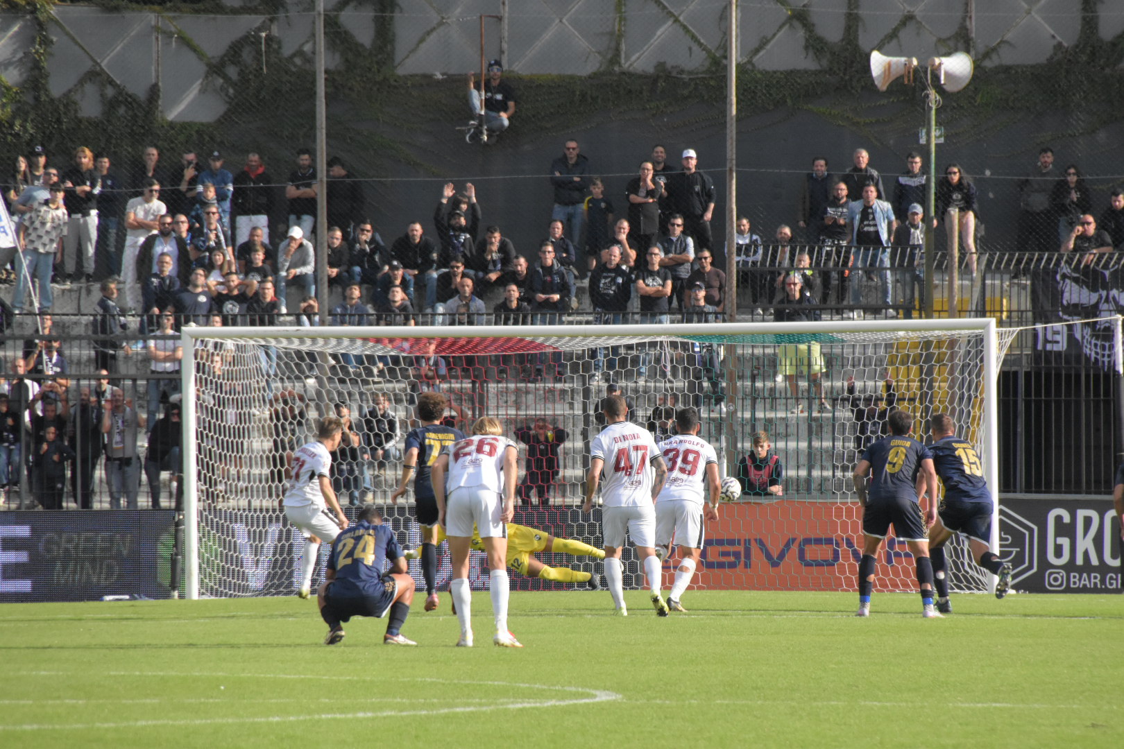 Pochi minuti dopo è il Trapani a sfiorare nuovamente la rete con un colpo di testa di Negro, dagli sviluppi di corner, ma Boffelli blocca il pallone centrale. Al 74’ arriva l’episodio che determina la gara: Pelamatti stende Ciotti in area, l’arbitro assegna subito il penalty. A nulla serve la chiamata fvs di Prosperi: il direttore di gara conferma la sua decisone e Fischnaller, dagli undici metri, porta in vantaggio la compagine siciliana.