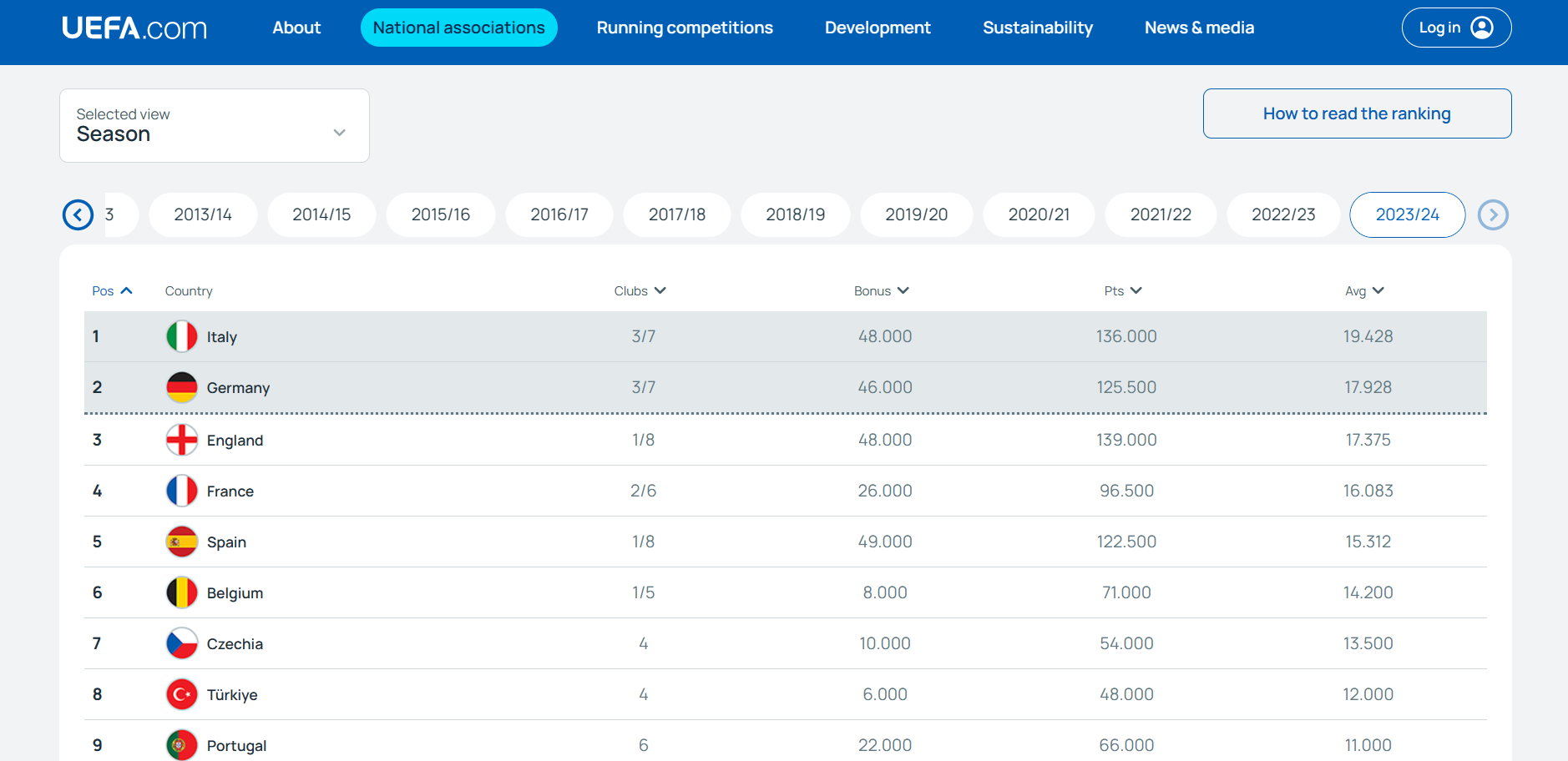 Le prime due squadre nella classifica annuale per il coefficiente club per paese otterranno il terzo e quarto slot disponibili. Sulla base dei criteri adottati per determinare la classifica annuale dei club, l’Italia dunque non può essere superata da nessun altro paese.
