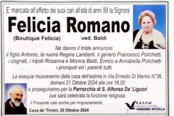 Le esequie muoveranno dalla casa dell'estinta in via Ernesto Di Marino, 36, oggi 21 ottobre, alle ore 16:00, e proseguiranno per la parrocchia di Sant'Alfonso de' Liguori dove sarà celebrato il rito funebre. Seguirà il trasporto al cimitero di Cava de' Tirreni